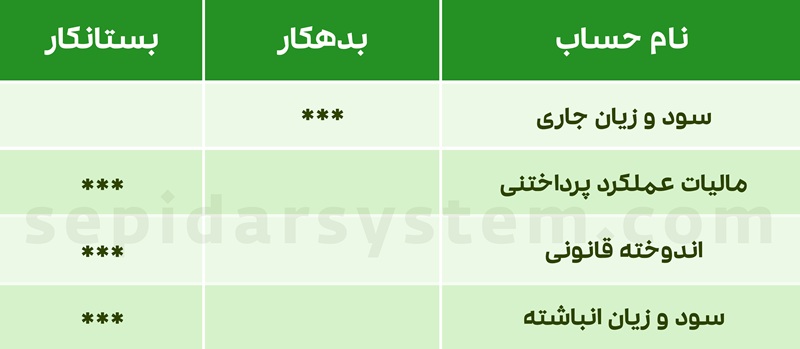 برای ثبت سند حسابداری سود قابل تقسیم بهتر از ابتدا سند بستن حساب سود و زیان جاری به سود و زیان انباشته را بررسی نماییم. پس از بستن حسابهای سود و زیانی و تعیین مبالغ اندوخته قانونی و مالیات عملکرد پرداختنی ثبت سند زیر انجام میشود: