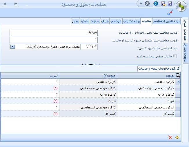 نکته: طبق قانون بیمه، اگر عامل‌هایی مانند بن و مسکن در لیست و دیسکت بیمه نمایش داده نشود سازمان بیمه جریمه در نظر خواهد گرفت. در تب مالیات می‌توانیم تنظیمات مربوط به مالیات و کارکرد بیمه و مالیات را انجام بدهیم: