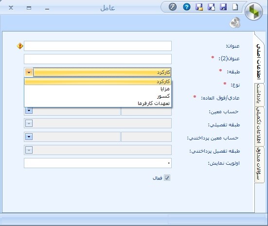 عامل جدید را از سیستم حقوق دستمزد کلیک کنید عنوان را وارد کنید (مثلاً حق آکورد) در عامل چهار نوع طبقه موجود است که شامل کارکرد، کسور، مزایا، تعهدات کارفرما که بسته به نوع عامل می‌توان برحسب این انتخاب کرد. طبقه مزایا به سه نوع قابل تقسیم است: قرارداد ثابت، محاسباتی، ورود دستی و اگر طبقه ما کارکرد باشد نوع قرارداد شامل: کارکرد روزانه، کارکرد ساعتی دقیقه و کارکرد درصدی است.