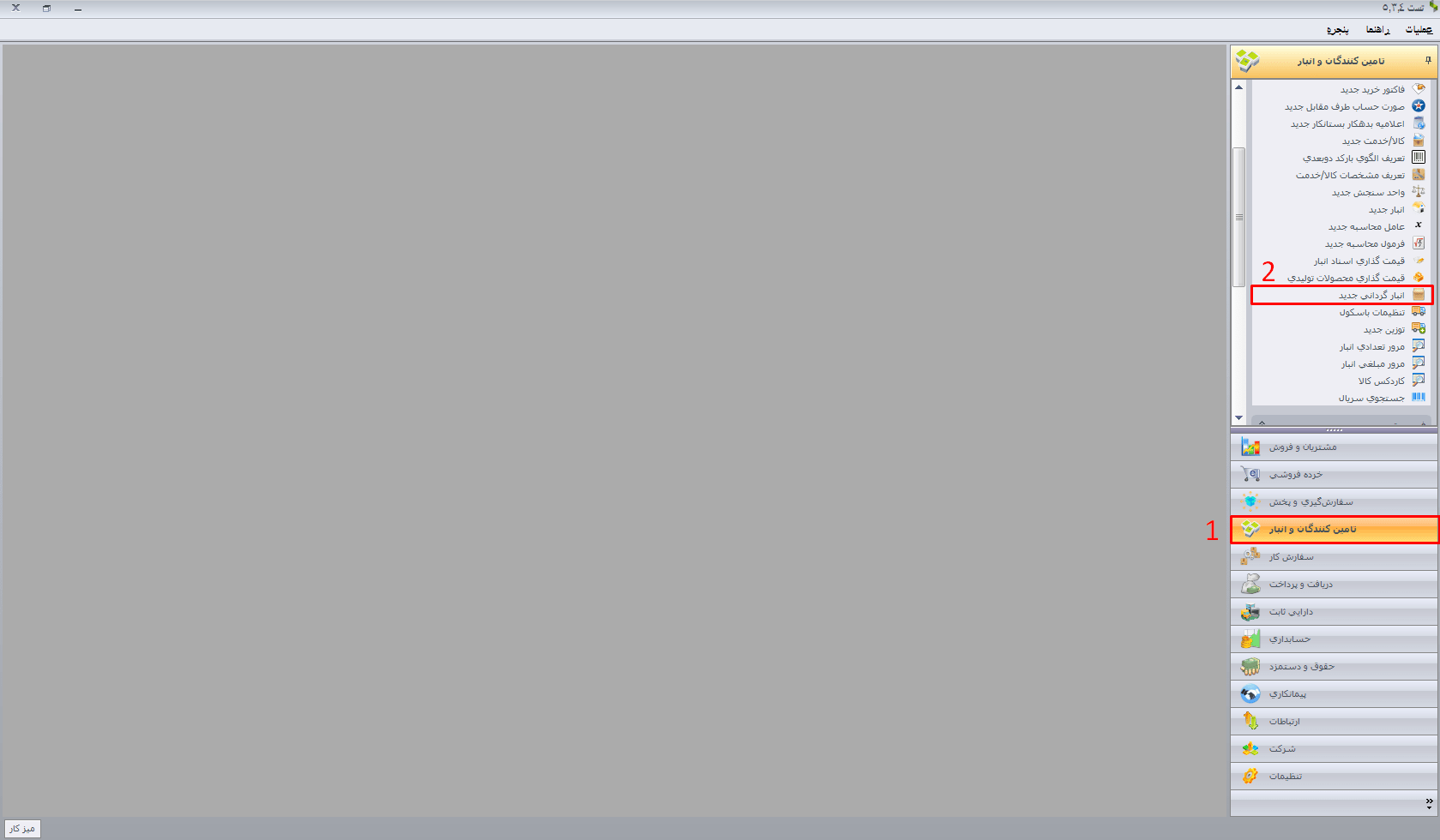 بهمنظور ثبت عملیات انبارگردانی در نرم افزار حسابداری سپیدار، ابتدا در منوی عمودی وارد ماژول «تأمینکنندگان و انبار» شده و از قسمت عملیات، فرم “انبارگردانی جدید” را انتخاب نمایید.