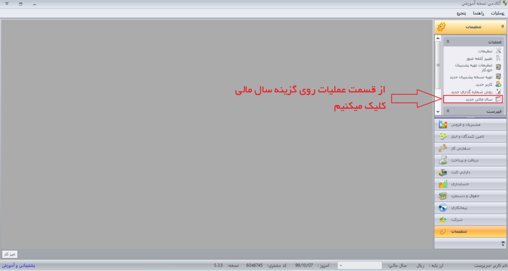 برای تعریف سال مالی از بخش تنظیمات نرم افزار، بخش عملیات گزینه سال مالی جدید را انتخاب کنید. در فرم تعریف سال مالی آیتم های “عنوان”، “تاریخ شروع” و “تاریخ پایان” را وارد کنید.