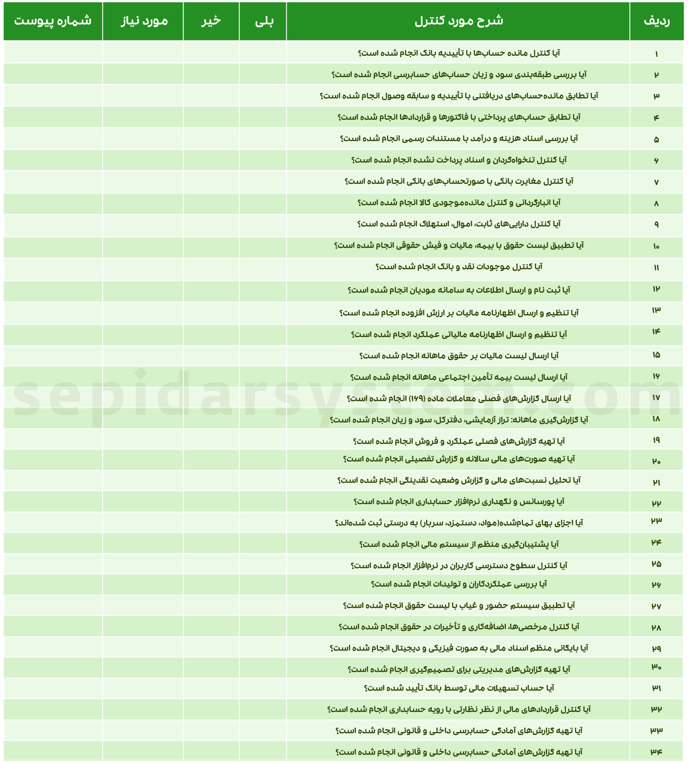 چکلیست پیشنهادی تحویلگیری امور مالی و مالیاتی