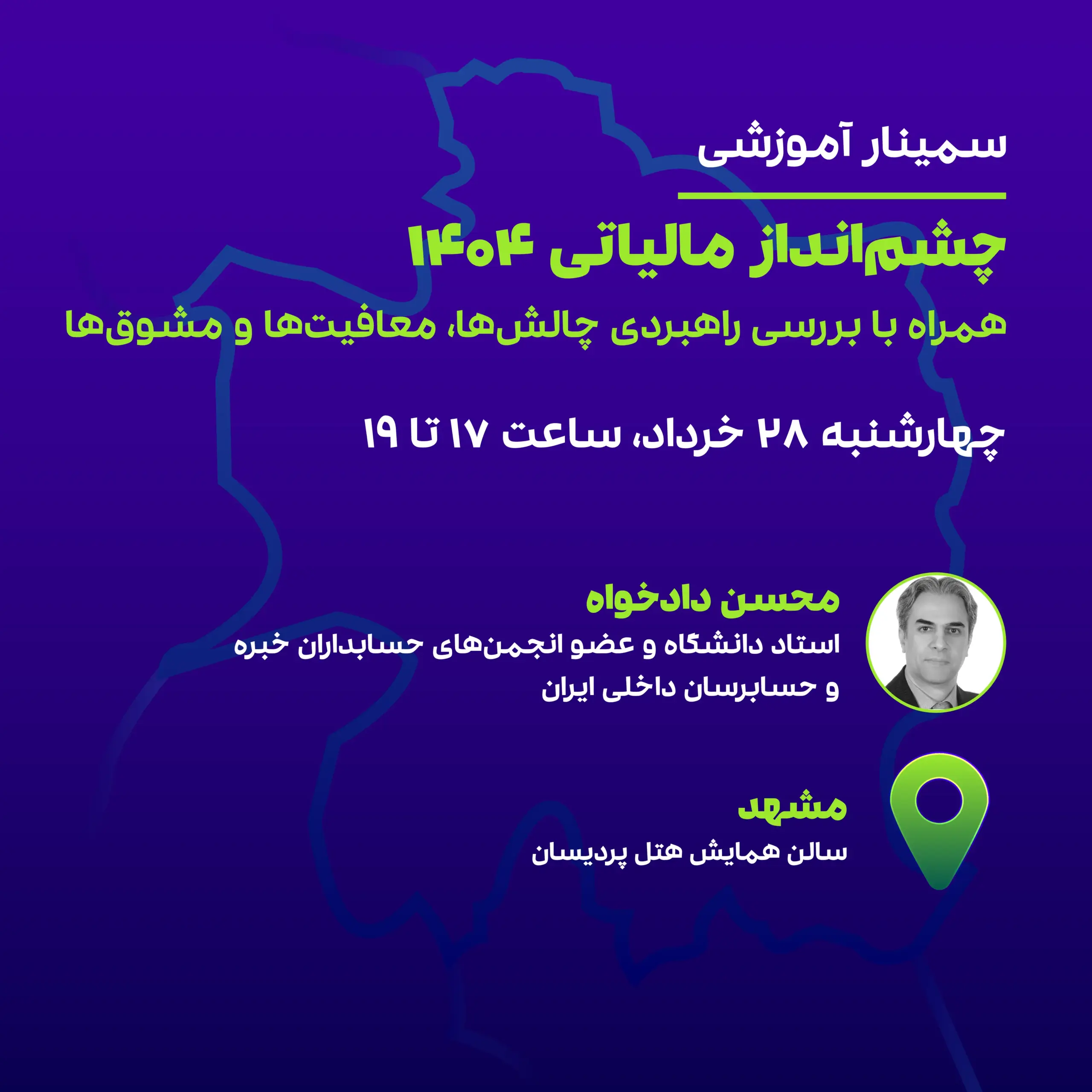 در سمینار آموزشی جامع و کاربردی “چشمانداز مالیاتی 1404 ” در شهر مشهد به بررسی چالشها، معافیتها و مشوقها میپردازیم . و با ارائه آموزشهای عملی و هدفمند، شما را برای مواجهه با چالشهای مالیاتی تا پایان سال 1404 و همچنین مشوقها و معافیتهای آن آشنا میکنیم.